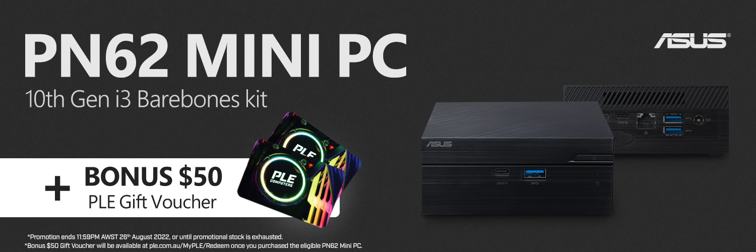 *Terms and conditions apply. This offer is not valid in conjunction with any other offer. Bonus $50 Gift Voucher will be available at ple.com.au/MyPLE/Redeem once you purchased the eligible PN62 Mini PC.