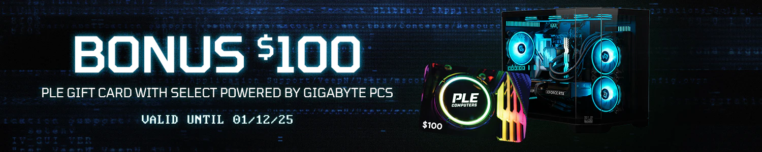Get a $100 PLE Gift Card with purchase of Powered by Gigabyte Prebuilt Gaming PCs during our Cyber Weekend Sale.